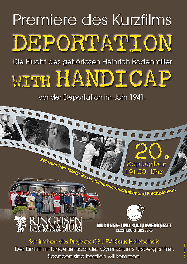 Ein besonderes Schulprojekt des Ringeisen-Gymnasiums erinnert an die Opfer der nationalsozialistischen „Euthanasie“-Verbrechen: Menschen mit Behinderung, die während des NS-Regimes gewaltsam ums Leben kamen. Im Rahmen eines P-Seminars unter Leitung von Mathias Jannetti produzierten 13 Schülerinnen und Schüler der 11. Jahrgangsstufe den Kurzfilm „DEPORTATION WITH HANDICAP". Die Premiere fand am 20. September 2025 mithilfe der BuKK statt. Der Film erzählt die wahre Geschichte des gehörlosen Heinrich Bodenmiller aus Ursberg, der sich 1941 der drohenden Deportation entziehen konnte. Gedreht wurde unter anderem an originalen Schauplätzen in Ursberg.