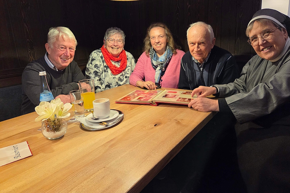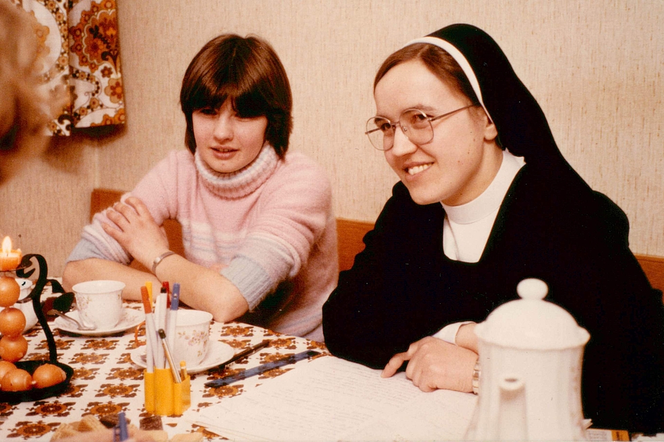 Lebhaft werden Erinnerungen ausgetauscht. Lachend fallen sich die Damen ins Wort, als sie an die Anfänge zurückdenken: „Im Wohnheim – das heutige Haus Joachim in der Angelina-Martin-Straße – waren zu Beginn des neuen Schuljahres im Neubau zwar noch nicht alle Baumaßnahmen abgeschlossen. Dafür haben wir im Keller die überzähligen Rosshaarmatratzen aneinandergenäht und uns mit weiteren ausrangierten Möbeln einen tollen Partyraum geschaffen“, erinnert Schwester M. Lucia und findet im mitgebrachten Fotoalbum auch die Beweisbilder. Zeugnisse fröhlicher Zusammenkünfte im Untergeschoss des Wohnheims gemeinsam mit den Zivildienstleistenden sind ebenfalls im Album zu sehen und wecken Erinnerungen an die gestrenge Schwester M. Diethart. Ihre Aufgabe war es, im Treppenhaus des Wohnheims darüber zu wachen, dass die Zivis und die ersten männlichen HEP-Schüler ihre Unterkünfte auf der rechten Seite des Hauses nicht mit den Zimmern der jungen Damen in der linken Haushälfte verwechselten. Es gelang nicht immer.