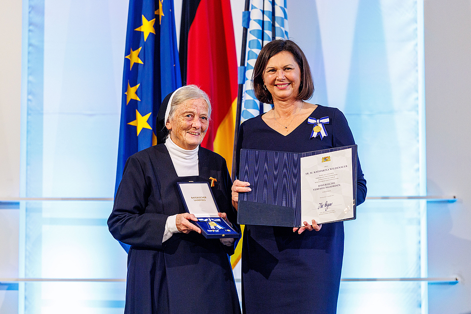 Der Bayerische Landtag ehrt mit dem Verfassungsorden Bürgerinnen und Bürger, die sich aktiv für die Werte der Bayerischen Verfassung engagieren. Seit 60 Jahren ist sie öffentliche Anerkennung für Bürgerinnen und Bürger, die sich herausragend für das Gemeinwohl engagieren und damit die Werte der Bayerischen Verfassung mit Leben füllen. Gemeinsam mit Sr. Katharina wurden heute 49 Persönlichkeiten ausgezeichnet. Darunter finden sich auch diesmal wieder bekannte Persönlichkeiten wie der Kabarettist Django Asül, die Schauspielerin Maria Furtwängler-Burda, die Verlegerin Angelika Diekmann, Schauspieler Heiner Lauterbach oder Sportler wie der Para-Olympiasieger Josia Topf und die Sportlerinnen Giulia Gwinn und Anne Haug, aber auch die Zeitzeugin Eva-Maria Umlauf sowie Bürgerinnen und Bürger, die für ihr jahrzehntelanges Engagement beispielsweise bei BRK oder THW geehrt werden.